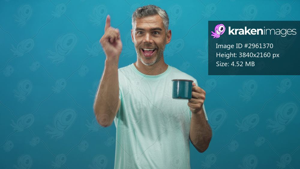 Man middle age grey hair holding a mug and beckoning with outstretched hand in studio, smiling broadly and presenting cup to viewer; welcoming.
