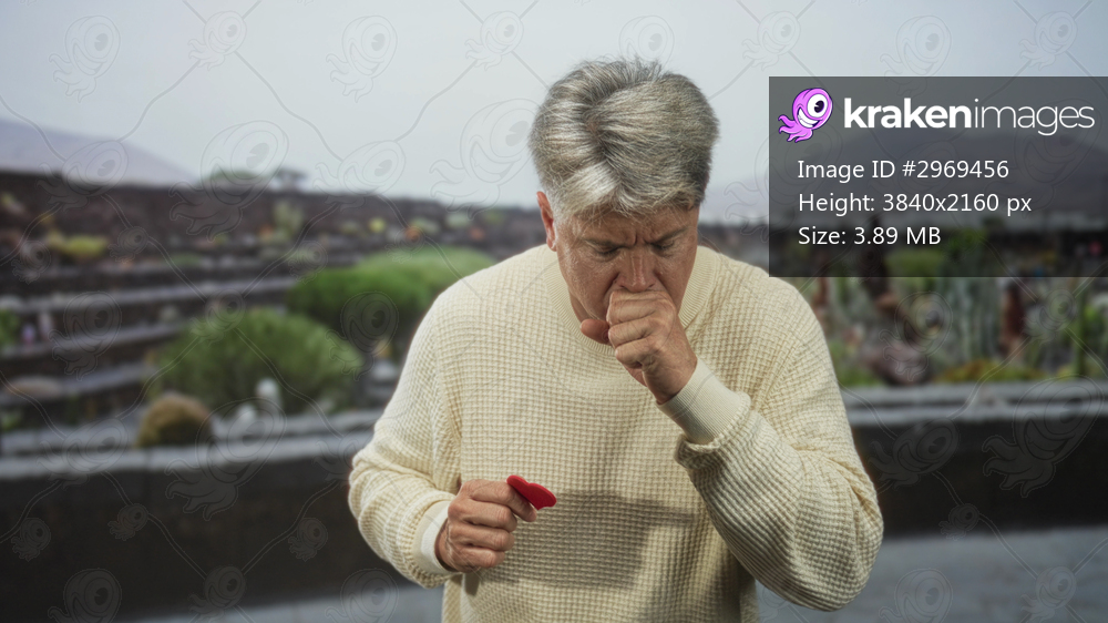Man middle age grey hair holding a small red heart and coughing into his fist on a stone terrace at building; concern heartache.