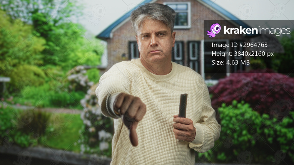 Man, middle age with grey hair, holding a tv remote control and giving a thumbs up gesture while standing before a brick building facade; contemplative. - Kraken Images
