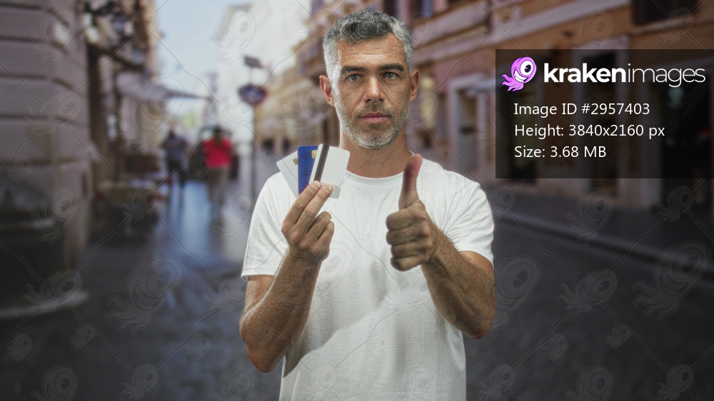 Man middle age with grey hair holding credit cards fanned in one hand and pinching fingers with the other while standing on a street in a shopping district; financial worry. - Kraken Images