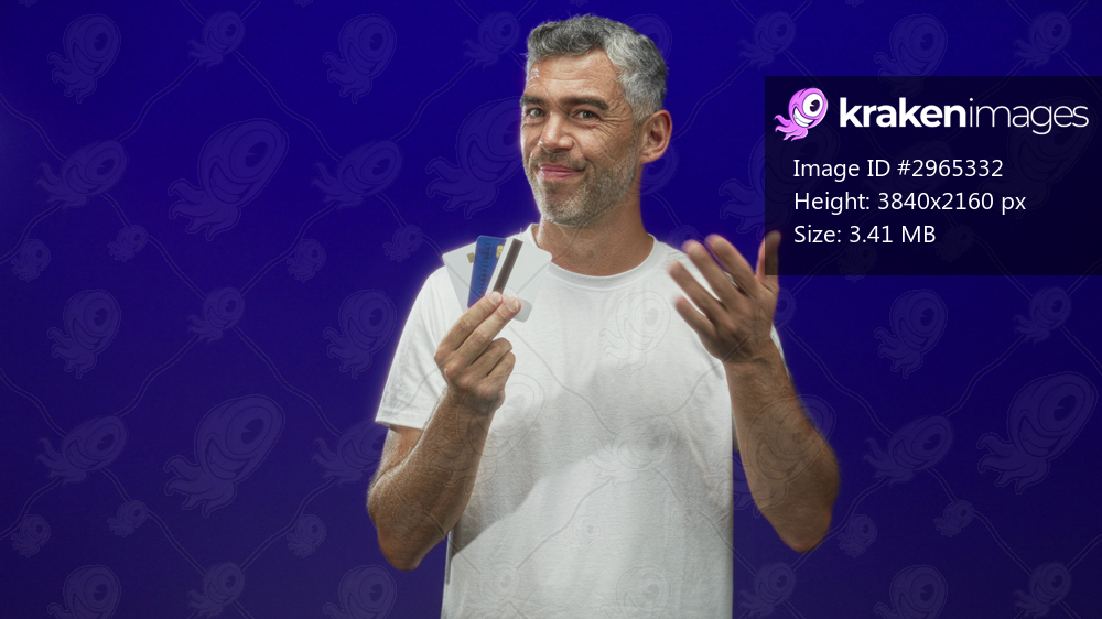 Man middle age with grey hair holding creditcard fanned in left hand while gesturing thumb toward himself and smiling in studio; financial confidence.