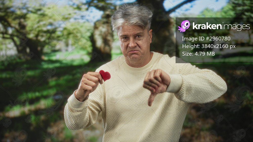Man middle age grey hair holding small red fabric heart, thumb down and pointing finger in forest; lost love disappointment.
