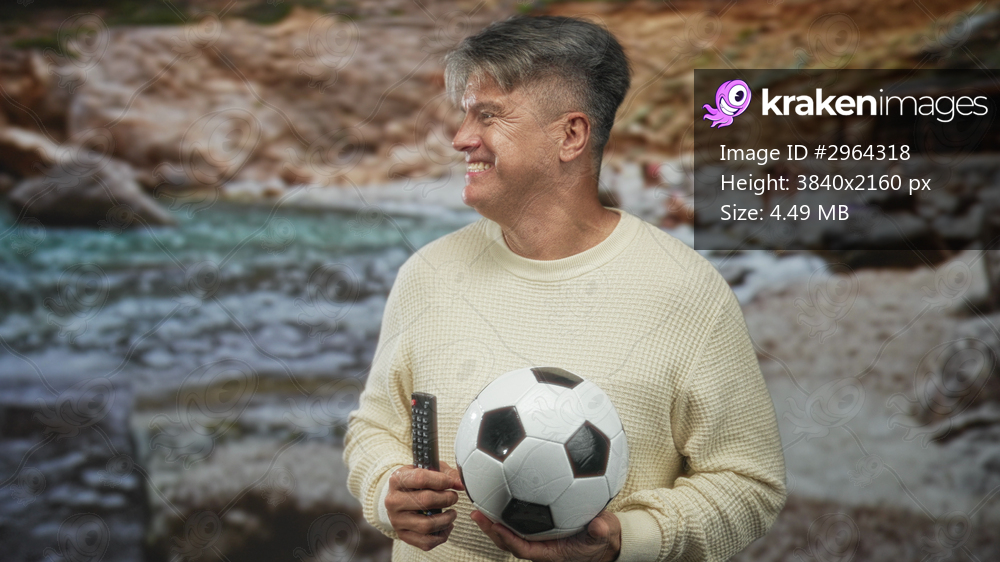 Man middle age grey hair holding soccer ball and tv remote while smiling toward camera in studio, wearing knit sweater and presenting props; playful leisure. - Kraken Images