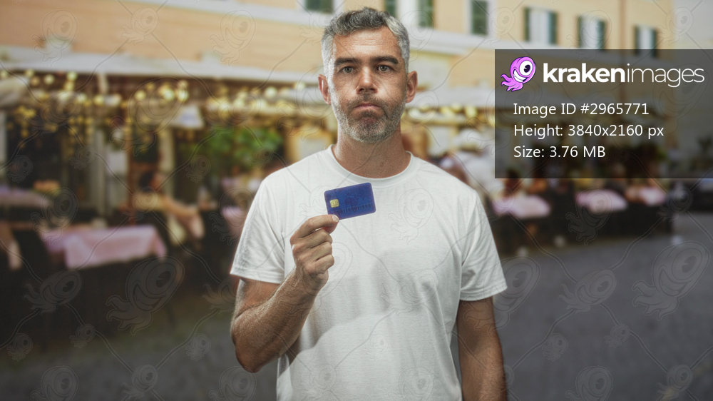 Man middle age grey hair holds blue creditcard, presenting it while smiling, wearing white t shirt at street cafe with outdoor tables; financial relief. - Kraken Images