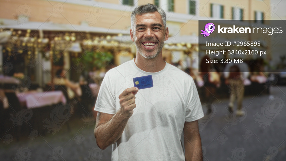 Man middle age grey hair holds blue creditcard, presenting it while smiling, wearing white t shirt at street cafe with outdoor tables; financial relief. - Kraken Images