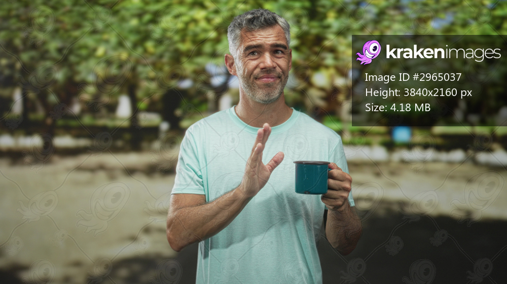 Man middle age grey hair holds teal mug with left hand and raises right hand in a gentle wave in a park; relaxation morning routine.