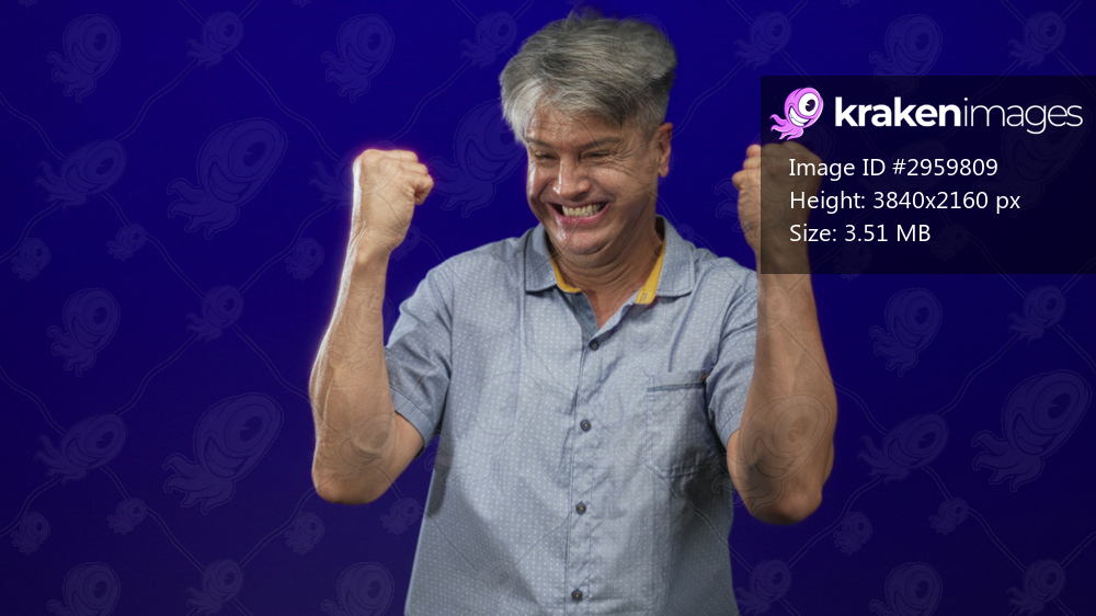 Man middle age grey hair smiling broadly raising clenched fists near chest in blue studio backdrop wearing short sleeve shirt; joy triumph.