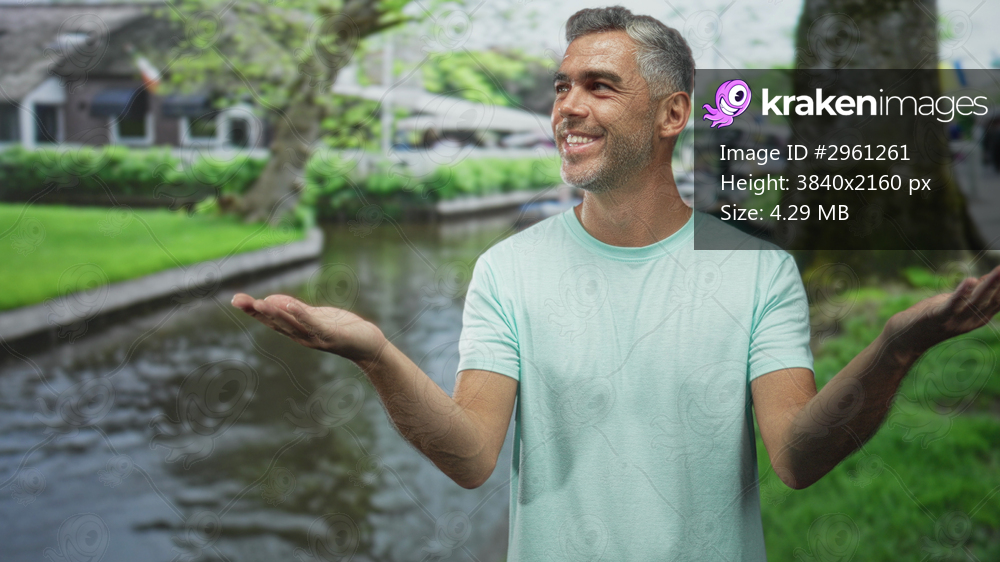 Man middle age grey hair smiling with outstretched palms beside a canal on a street wearing light teal t shirt; optimism.