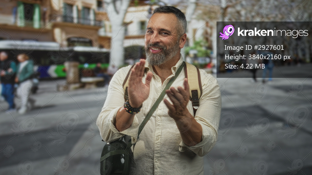 Man, middle age hispanic with backpack and canteen smiling and gesturing on busy city street lined with trees and buildings; travel joy.
