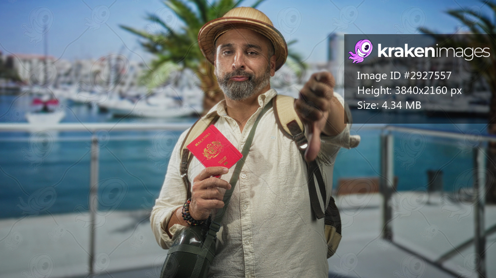 Man middle age hispanic with grey beard and hat holding passport and giving thumbs down on street by marina boats and palm tree; travel frustration.