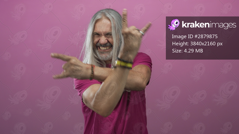 Man middle age with hoary long hair grinning while showing rock horns hand gesture in pink studio with bracelets and rings visible; rebellion attitude energy. - Kraken Images