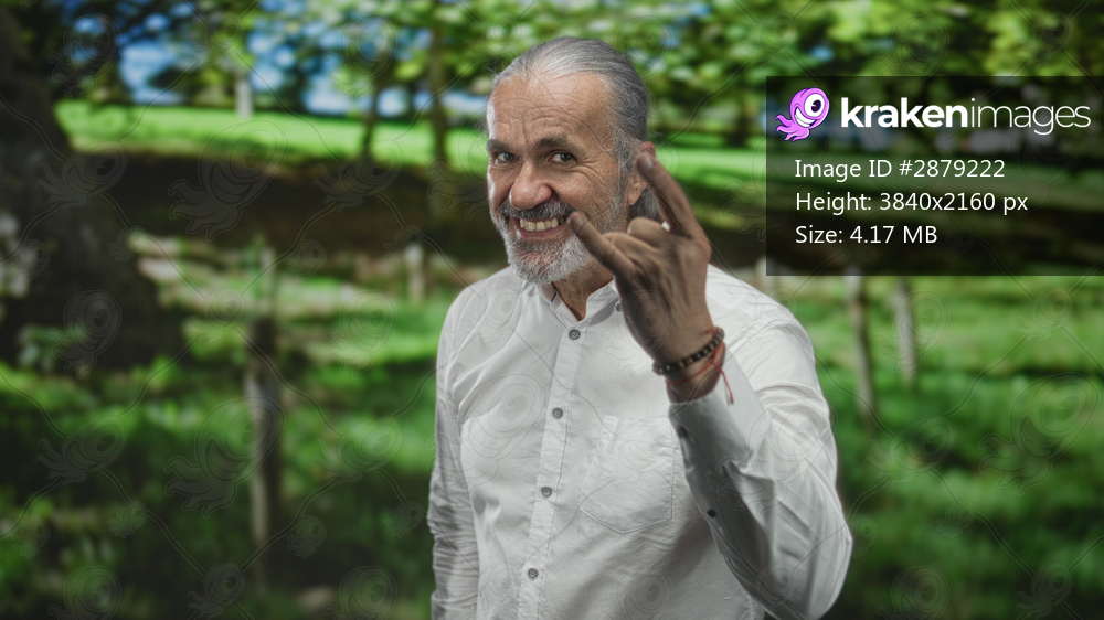 Man, middle age with hoary long hair making rock horns gesture in forest park while smiling and wearing a white shirt; joy celebration.