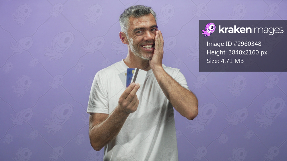 Man middle age holding creditcard and debitcard with right hand, left hand covering eye while smiling before a purple studio wall; relief.