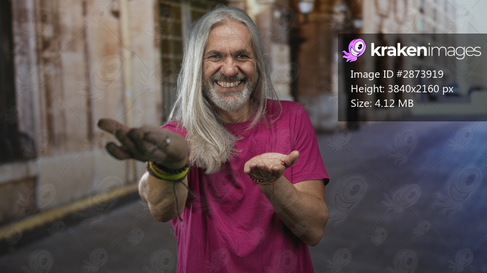 Man middle age with long gray hair and beard, smiling with open palms gesture on a sunlit cobblestone street; joy sharing.