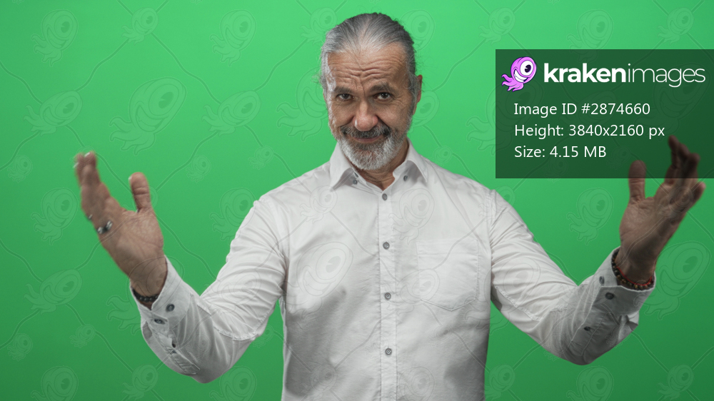 Man middle age with long gray hair and open palms gesturing in green studio wearing white shirt; confidence communication.