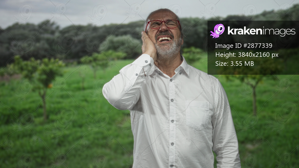 Man middle age with long grey hair and beard holding cheek for toothache in forest orchard field, wearing red glasses and white shirt; pain.