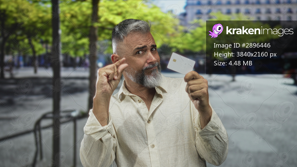 Man middle aged with gray beard holding a creditcard and pinching fingers to show a tiny amount on a busy street; financial doubt.