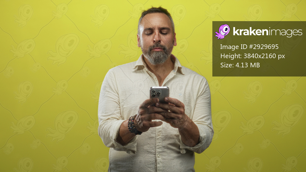 Man, middle aged with grey beard and grey hair, holding smartphone with both hands in a yellow studio; focused reflection.