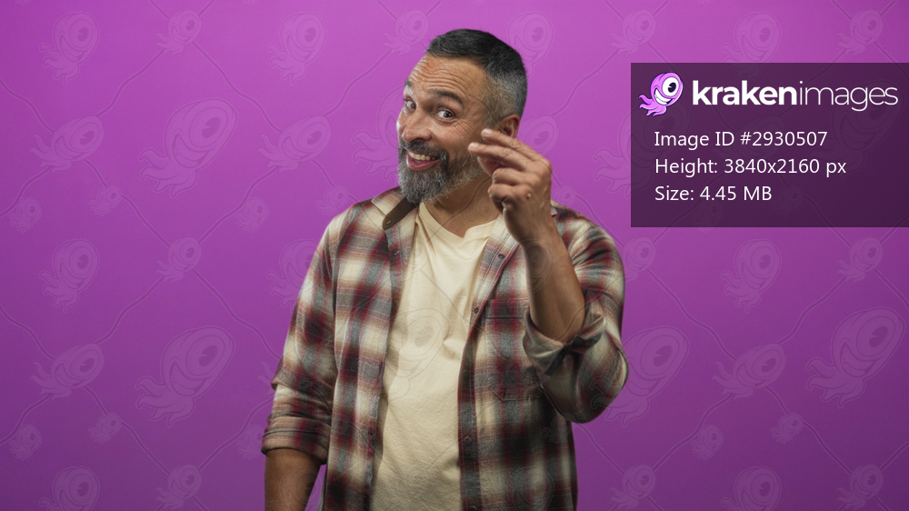 Man middle aged with grey beard pointing finger to mouth in purple studio, smiling in plaid shirt and casual pose; playful charm.