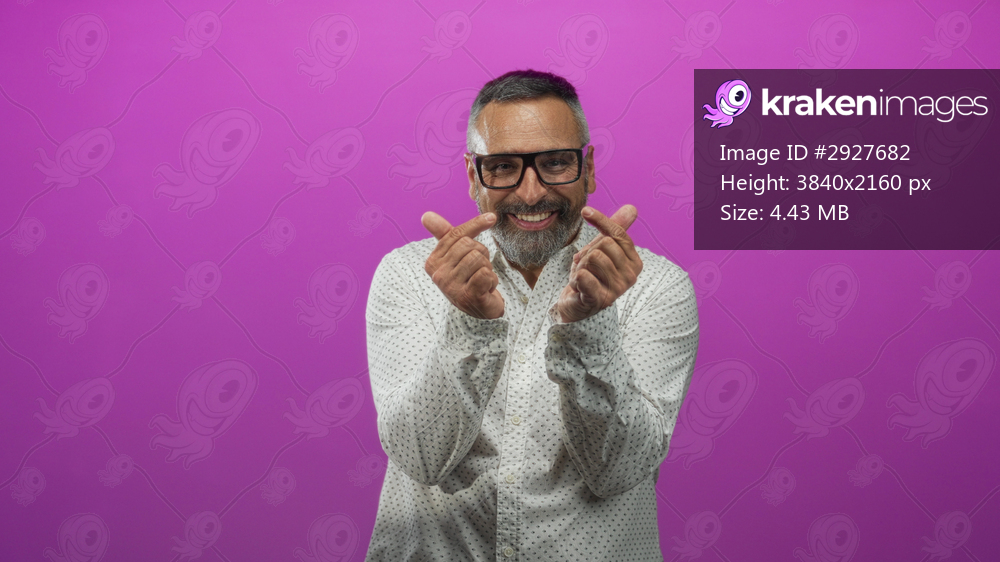 Man middle aged with grey hair and beard making finger heart gesture and smiling in magenta studio; playful affection.