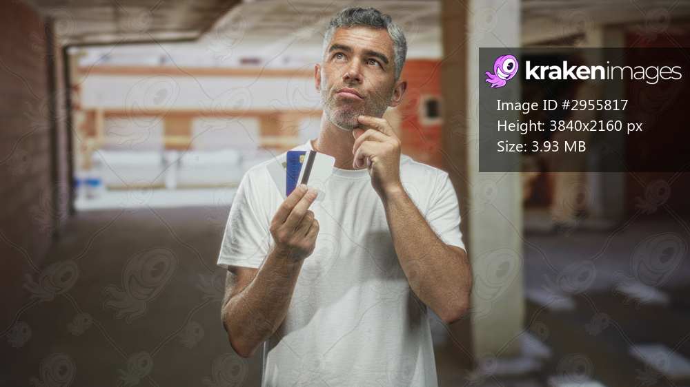 Man middle aged with grey hair holding several creditcards fanned in right hand, finger to chin thinking in an unfinished building; financial worry.