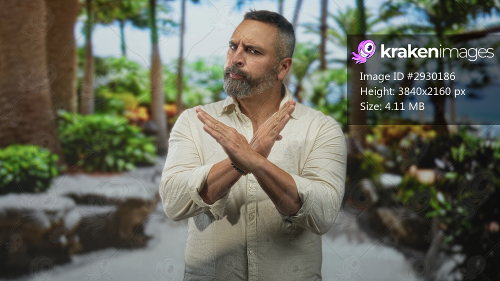 Man middle aged hispanic with grey beard and arms crossed x in park near palms and green foliage; boundary rejection.
