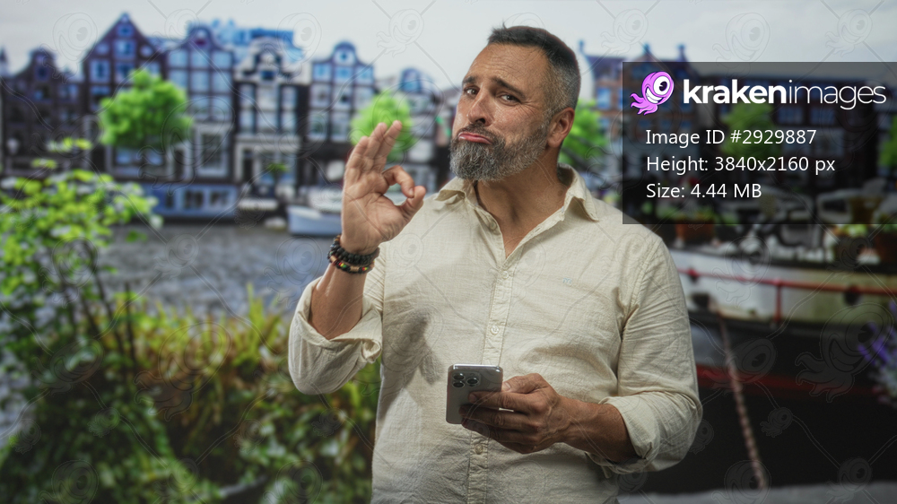 Man middle aged hispanic with grey beard showing ok hand gesture while holding smartphone on amsterdam street by canal; confidence travel leisure.