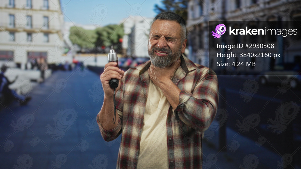 Man middle aged hispanic with grey hair holding handheld drill and touching neck on city street while grimacing; vulnerability resilience pain.