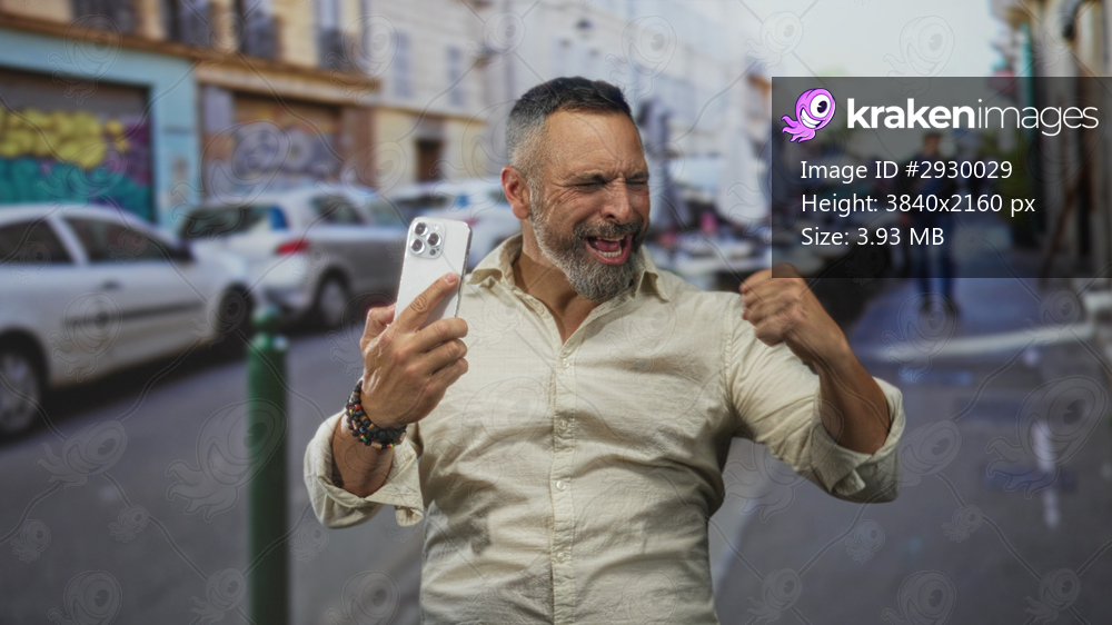Man middle aged hispanic grey hair holding smartphone with clenched fist and shouting while pointing at the screen on a city street with parked cars and cafe tables; triumph celebration victory. - Kraken Images