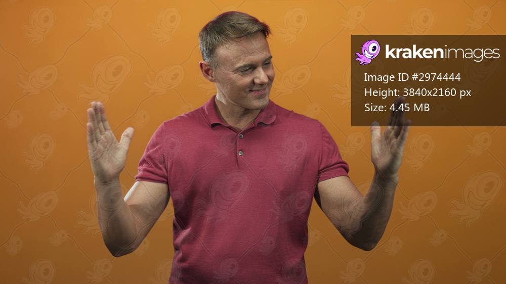 Man, middle aged hispanic, hands raised palms forward wearing maroon polo shirt, smiling in studio against an orange backdrop; approachable confidence. - Kraken Images