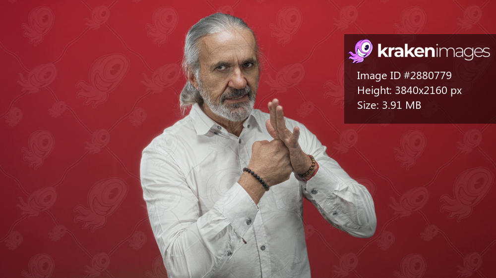 Man middle aged with hoary long hair and clenched fists in studio against red wall; strength determination resilience.