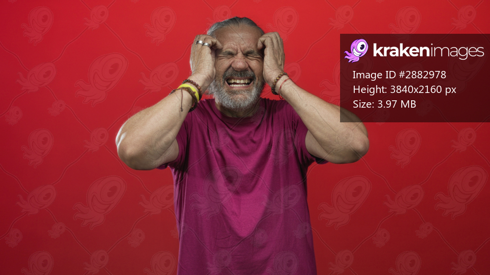 Man middle aged with hoary long hair holding temples with both hands for headache in studio with red backdrop; distress contemplation.