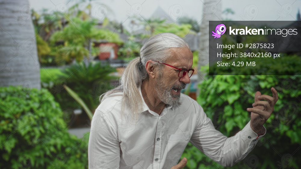 Man middle aged with long gray hair and red glasses wearing white shirt gesturing with right hand in park; joyful spontaneity.
