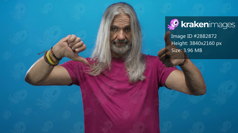 Man middle aged with long gray hair showing thumbs up and thumbs down while wearing a magenta shirt in a blue studio; ambivalence.