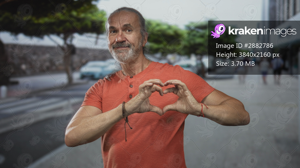 Man, middle aged with long grey hair and beard, in orange shirt forms a heart with hands and smiles on a busy city street; affection and connection.