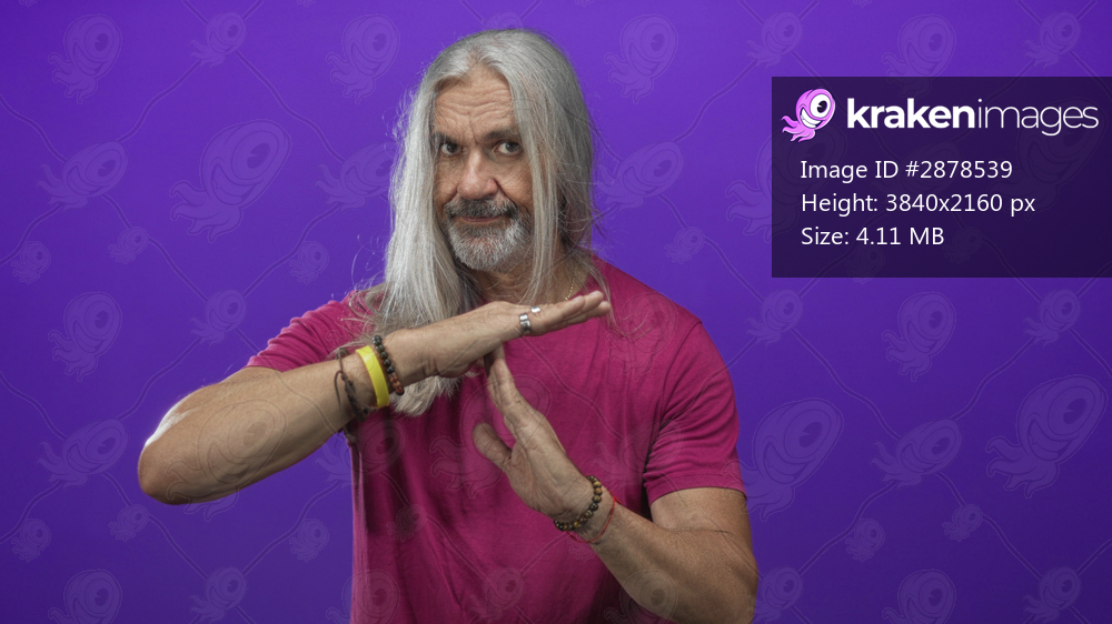 Man middle aged with long hoary gray hair showing hands in a time out gesture in a purple studio, wearing a magenta t shirt and bracelets facing camera; assertive. - Kraken Images