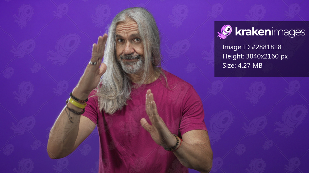 Man middle aged with long hoary gray hair showing hands in a time out gesture in a purple studio, wearing a magenta t shirt and bracelets facing camera; assertive. - Kraken Images