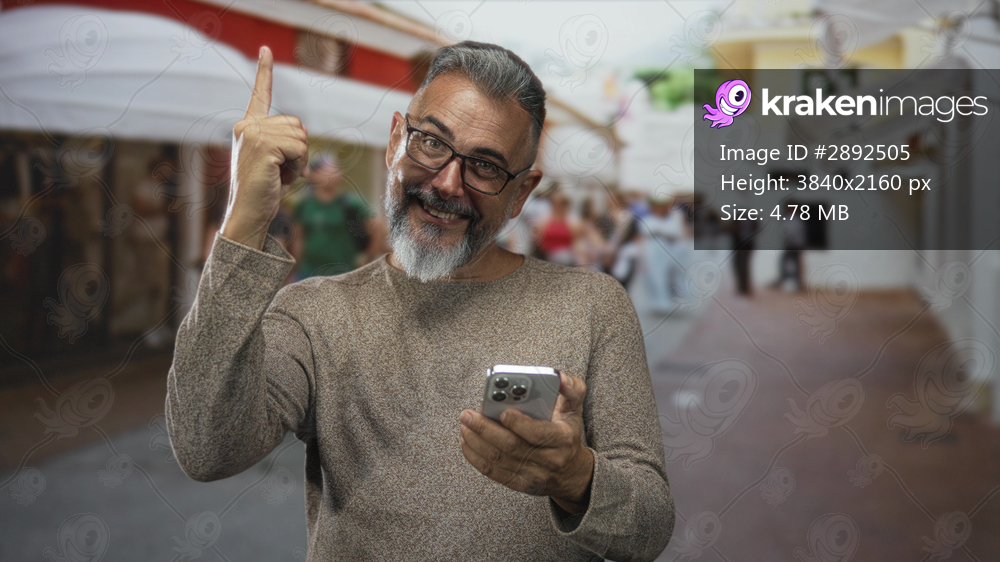 Man middle aged points finger up on street while holding smartphone and wearing glasses, smiling slightly; confidence curiosity.