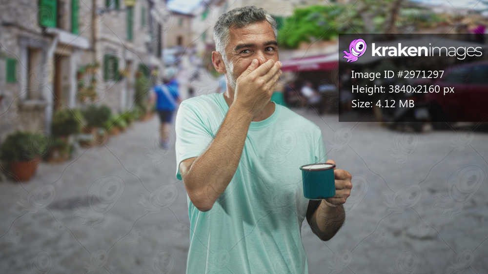 Man middleaged holding blue mug, hand covering mouth while standing on a street with cobblestone, cafe and scooter parked nearby; surprise curiosity.