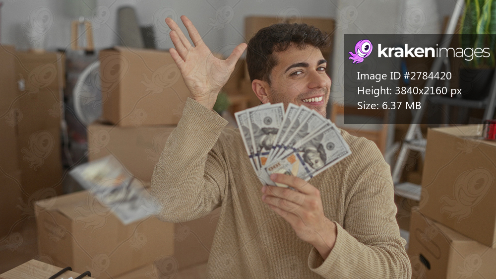 Man with money holds bills in home as hispanic young tenant loads new boxes moving cash.