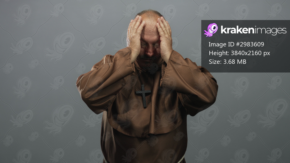 Man monk covering face with hands, wooden cross pendant visible over brown robe in studio; penance despair faith.