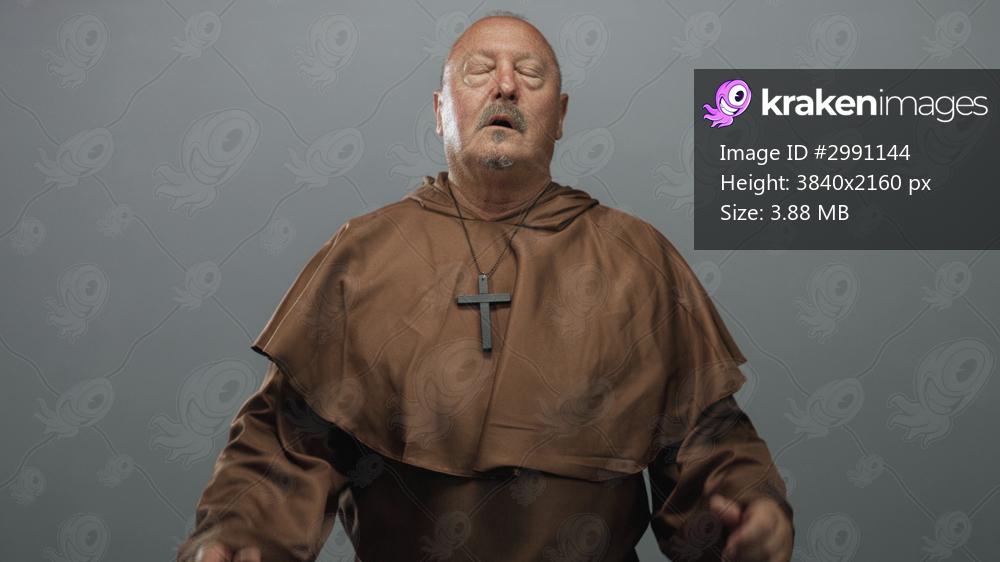 Man monk covering face with hands, wooden cross pendant visible over brown robe in studio; penance despair faith.