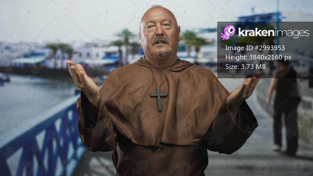 Man monk with hands pressed to chest wearing brown robe and cross, standing on street waterfront promenade in prayer; devotion reflection solitude.