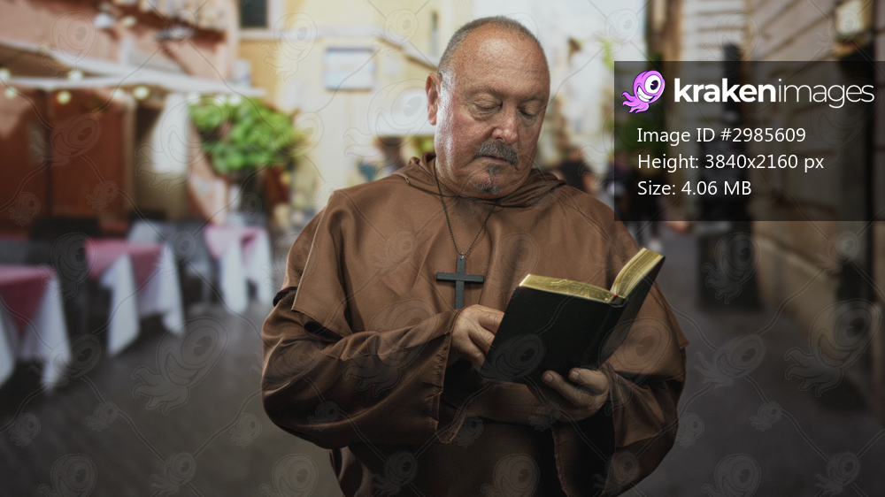 Man monk holding book with hands, reading and looking upward on a street cafe building while wearing robe and cross pendant; contemplation prayer serenity. - Kraken Images