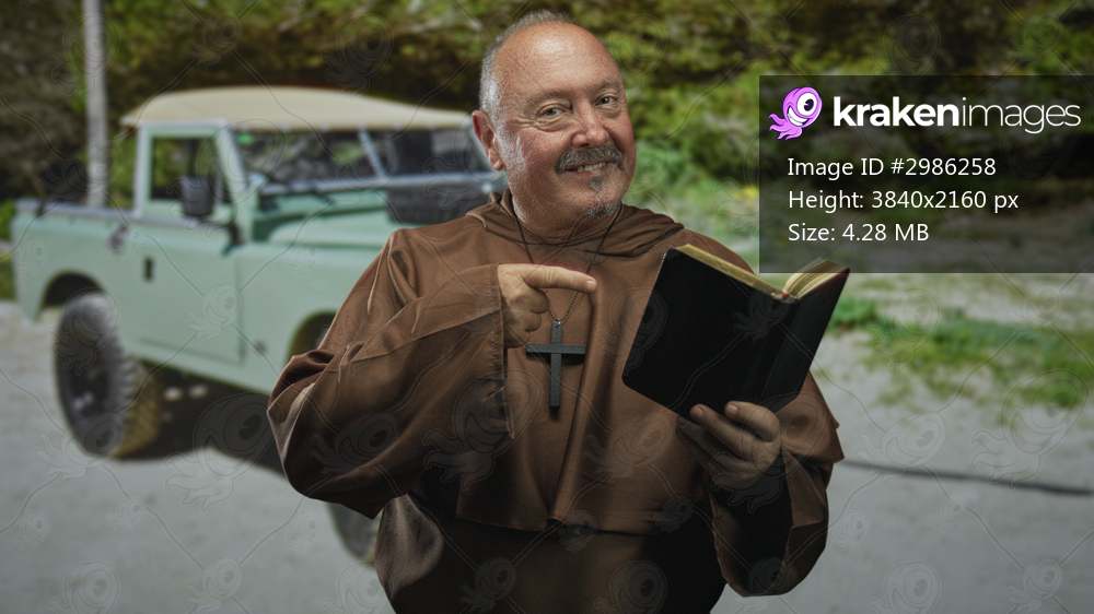Man monk in brown habit holding a bible and pointing finger at a cross pendant near a parked vintage suv in forest; devotion reflection.