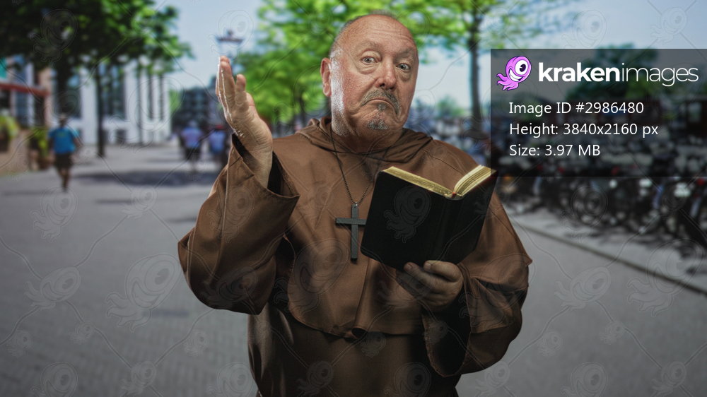 Man monk in brown habit holds a bible with left hand and raises right hand in street while reading aloud, gesturing blessing; devotion prayer.