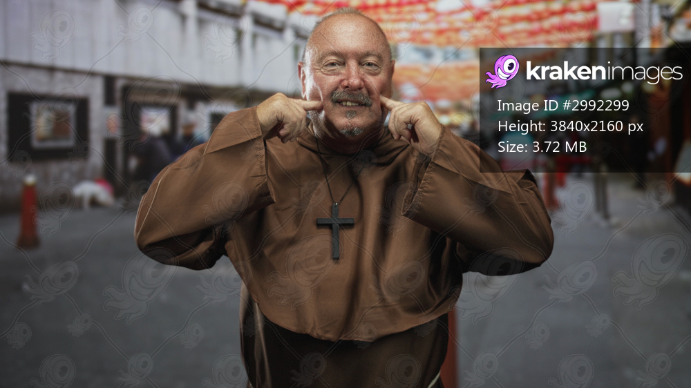 Man monk in brown habit points fingers to cheeks showing cross necklace on street market; playful devotion.