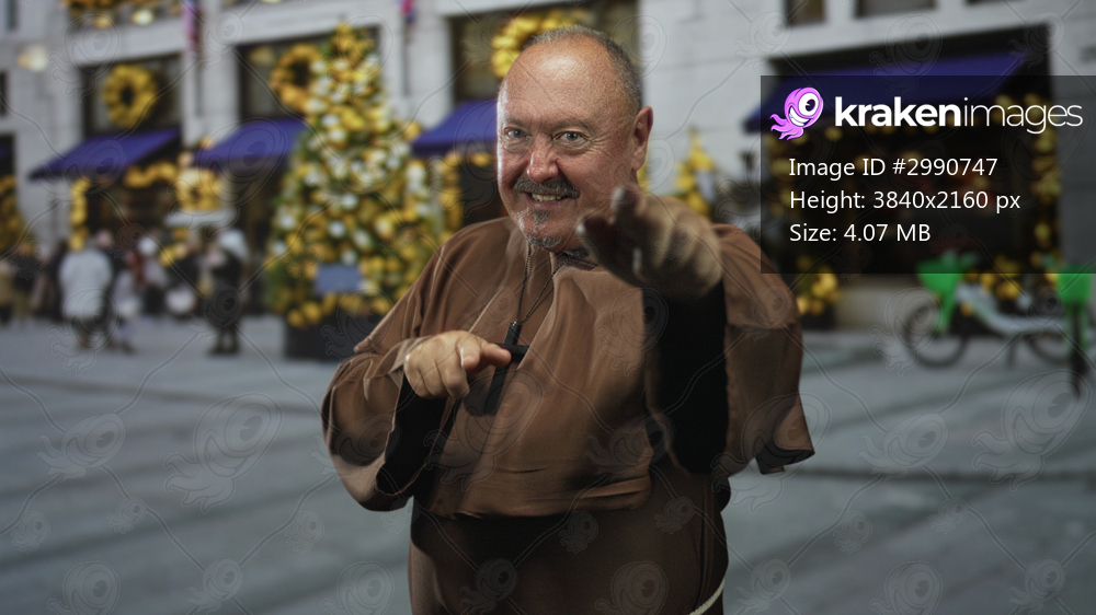 Man monk in brown habit and wooden cross points finger toward camera on a city street with christmas tree and shopfronts; playful accusation.