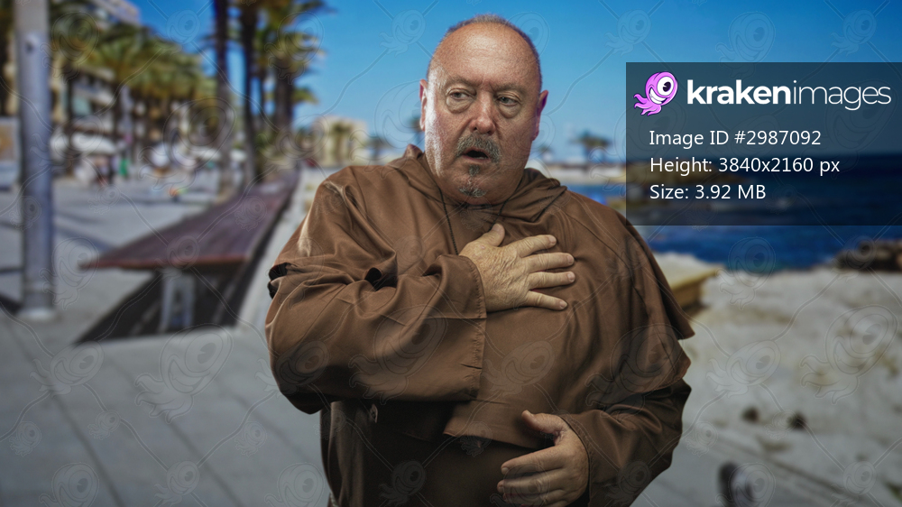 Man monk in brown robe with hand on chest clutching for heartattack on street by seaside promenade; faith devotion pain.