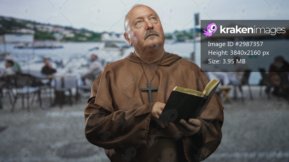 Man monk in brown robe holding a bible with eyes closed while reading on a waterfront street cafe, cross necklace visible; devotion serenity.